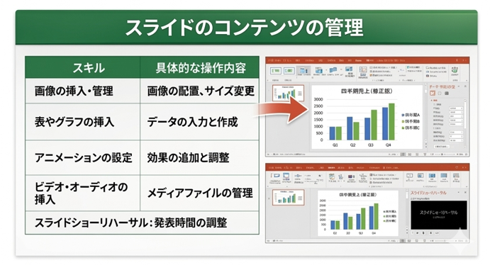 プレゼン資料の作成・編集・スライドショーの設定など、実務でもよく使う操作が出題されます。
