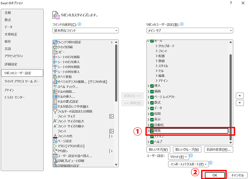 「リボンのユーザー設定」の中の「開発」にチェックを入れます。