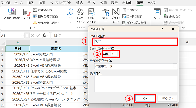 マクロ名は「コピペ」とし、ショートカットキーは「q」と設定しましょう。