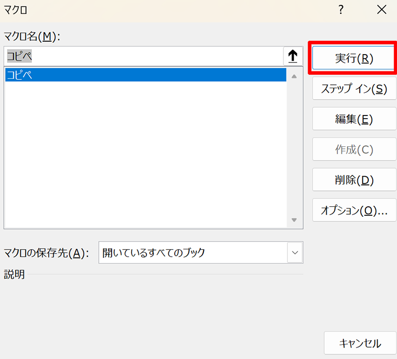 マクロのウィンドウで保存したマクロのマクロ名を選択し、「実行」ボタンをクリックします。