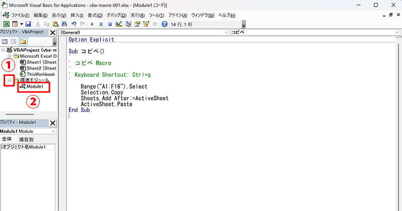 「Module1」をダブルクリックすると、右側のコードウィンドウにVBAのソースコードが表示されます。