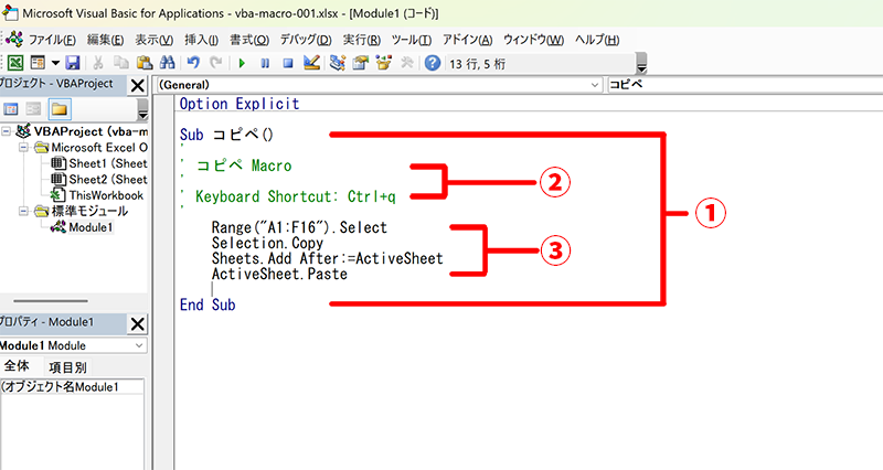 「Sub コピペ()~End Sub」までが、コピペという名前のマクロの開始と終了を意味しています。